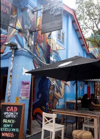 To be honest, We didn’tย know the exact locationย of Kampoeng Glam. hahaha. We just followed the map and other blogs’s direction, and then we found this big street with small and unique cafes around, but there weren’t that many like in Haji Lane, and also there are a few street arts, just a few. Kampoeng glam is not that far from Haji Lane, you canย walk there. But the question is, is this the right place? hahaha